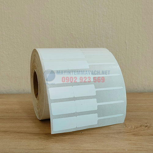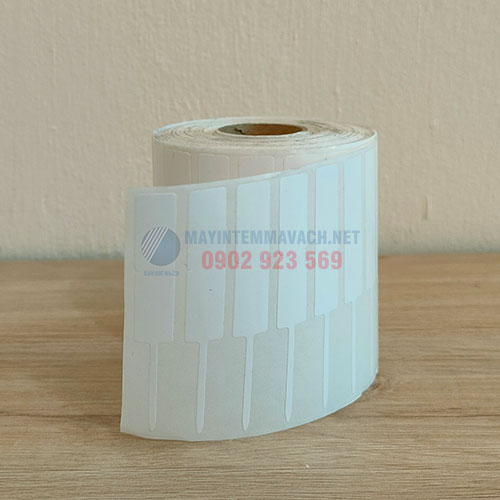 Quy cách tem có chiều ngang 40mm chia thành 2 mặt tem mỗi mặt 20mm, chiều cao 10mm bế thành dạng cuộn sử dụng cho các dòng máy in decal cuộn với phần đuôi dài 300mm thuận tiện cho việc tạo mắt xích đính kèm cùng sản phẩm.