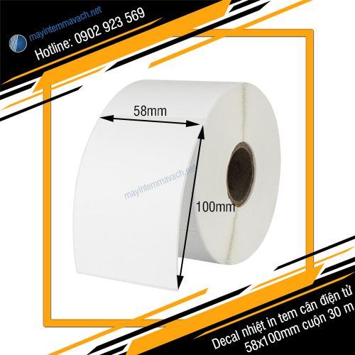 Decal nhiệt in tem cân điện tử 58x100mm cuộn 30 m sử dụng chuyên cho tem cân điện tử cho chức năng in tem nhãn dán với kích thước cuộn nhỏ gọn.