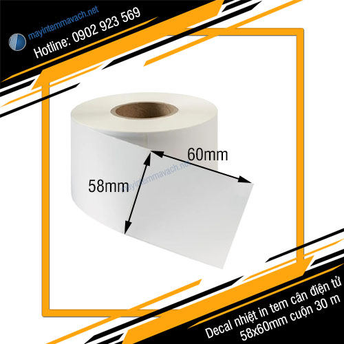 Decal nhiệt in tem cân điện tử 58x60mm cuộn 30 m thuộc loại tem nhãn dán được sử dụng cho các hoạt động in ấn thông tin về sản phẩm được cân trọng lượng bởi cân điện tử có chức năng in tem.