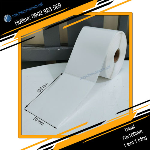 Decal giấy 70x100mm loại 1 tem 1 hàng với quy cách chiều ngang 70mm, chiều cao 100mm được ứng dụng phổ biến trong in tem phụ sản phẩm, tem nhãn mã vạch quản lý hàng hóa, tem vận đơn, tem TMĐT,...