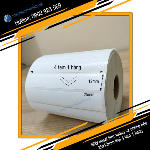 - Quy cách: Chiều ngang 25mm, chiều cao 12mm cho phép in ấn nhiều thông tin trên bề mặt con tem. Được bế 4 con tem trên 1 hàng giúp tăng hiệu suất máy in tem mã vạch lên 4 lần.