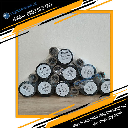 Nên thông thường người dùng lựa chọn mực in tem vàng bạc trang sức sẽ lựa chọn cuộn mực in có quy cách: 110mmx75m, 110mmx100m, 110mmx300m,...