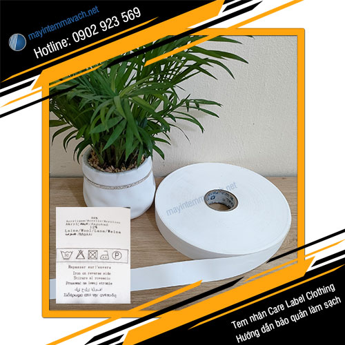 Tem nhãn Care Label Clothing, nhãn hướng dẫn bảo quản làm sạch được chế tạo từ tem nhãn vải là satin hoặc ruban. Ứng dụng: Hiển thị các hướng dẫn người dùng trong lưu trữ, bảo quản và làm sạch các sản phẩm thời trang. Con tem tồn tại song song cùng sản phẩm trong suốt quá trình tồn tại lẫn làm sạch - bảo quản nên chống chịu tốt trước các tác động của hóa chất, nhiệt độ cao, tác động lực,... Quy cách: Bế dạng cuộn, chiều ngang tùy chọn theo yêu cầu dùng, tổng chiều dài cuộn theo yêu cầu, màu sắc thường là màu trắng có thể lựa chọn màu.